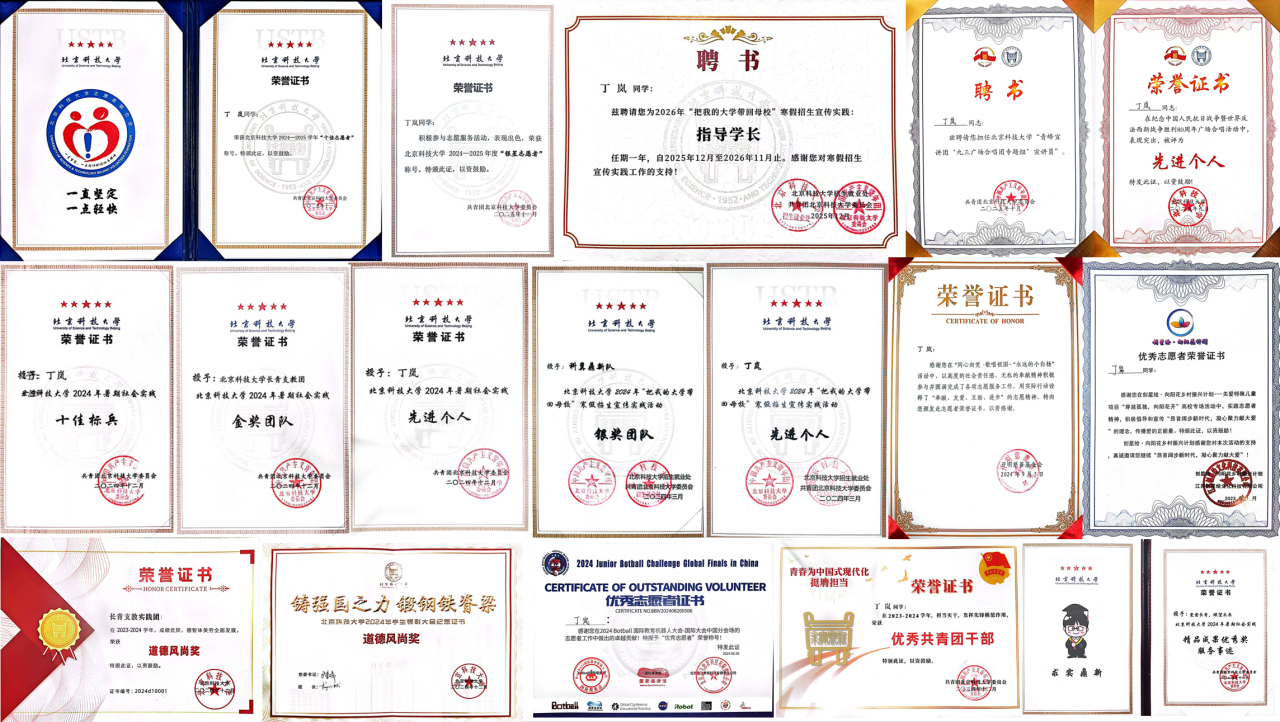 丁岚,女,中共党员,北京科技大学资源与安全工程学院安全工程专业2023级本科生。累计参与志愿活动30余项,现到梦空间志愿工时503小时、志愿北京254小时。曾获校“十佳志愿者”,银星志愿者,院“十佳志愿者”,广场合唱活动“先进个人”,2024年寒招银奖团队、先进个人,2024年暑期社会实践金奖团队、先进个人、十佳标兵,道德风尚奖,优秀共青团干部,优秀学生干部,优秀宿舍长。任安全2301团支部书记,院团委办公室主任,校团委实践部部长助理、功能型团支部团支书,党委组织部助管,青蜂宣讲团“九三广场合唱团专题组”宣讲员。