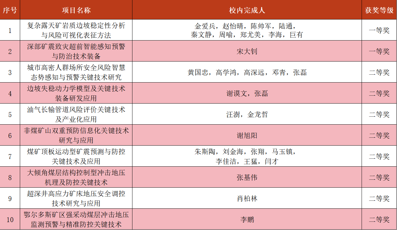 近日,第一届应急管理科技创新奖评选结果正式公布,北京科技大学共有11项科研成果获奖,其中资源与安全工程学院10项科研成果获奖,包括一等奖2项,二等奖8项。
