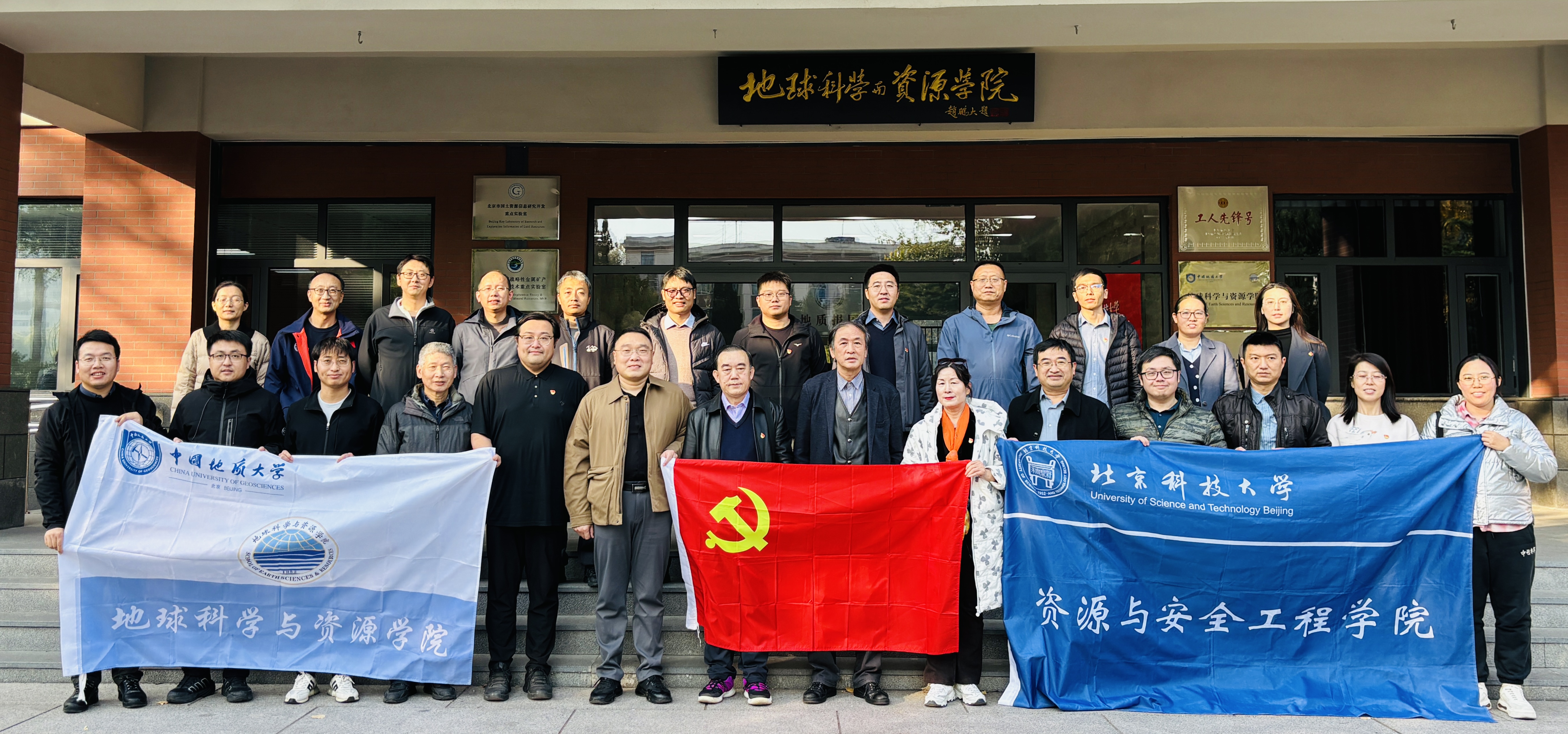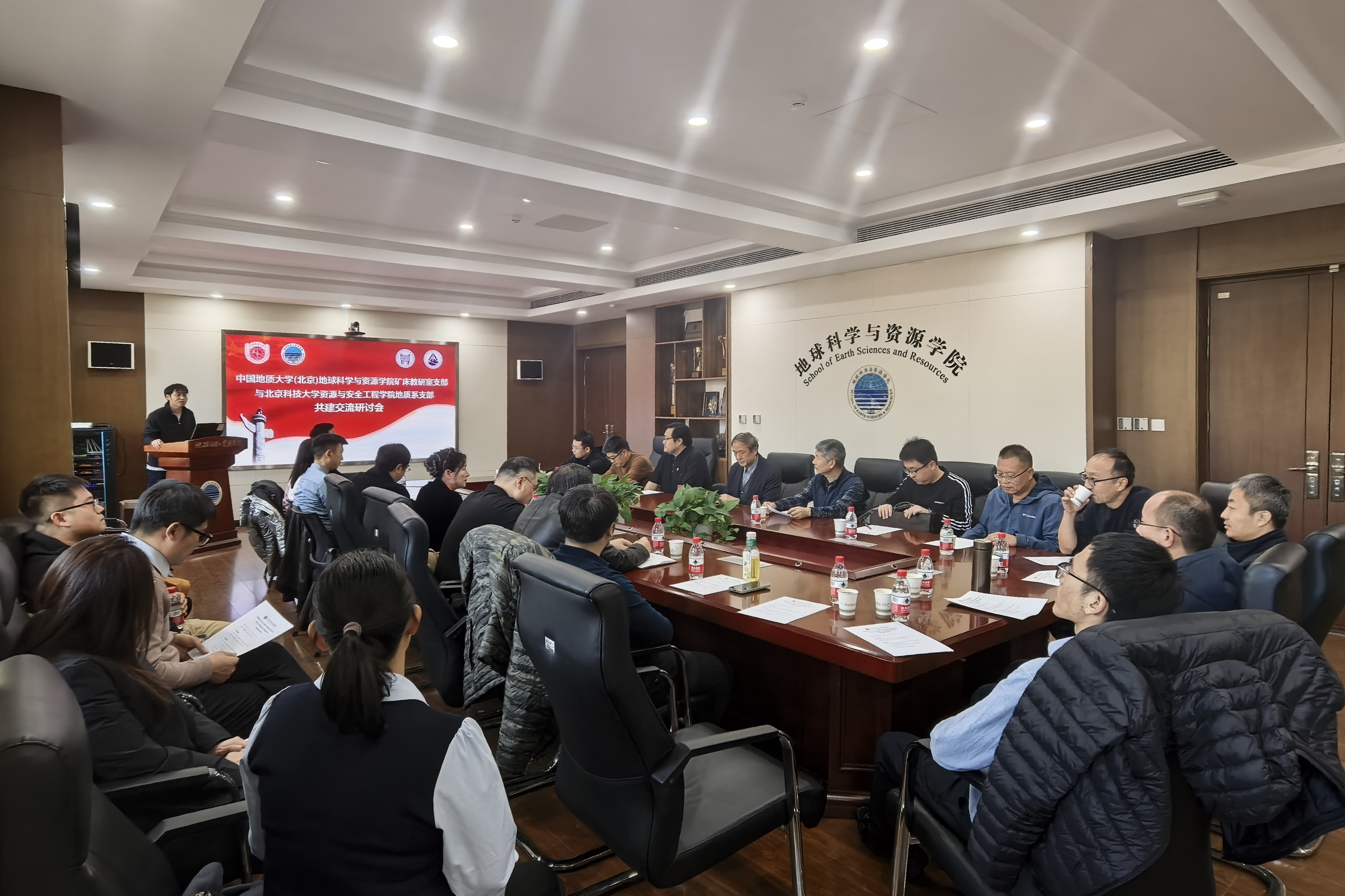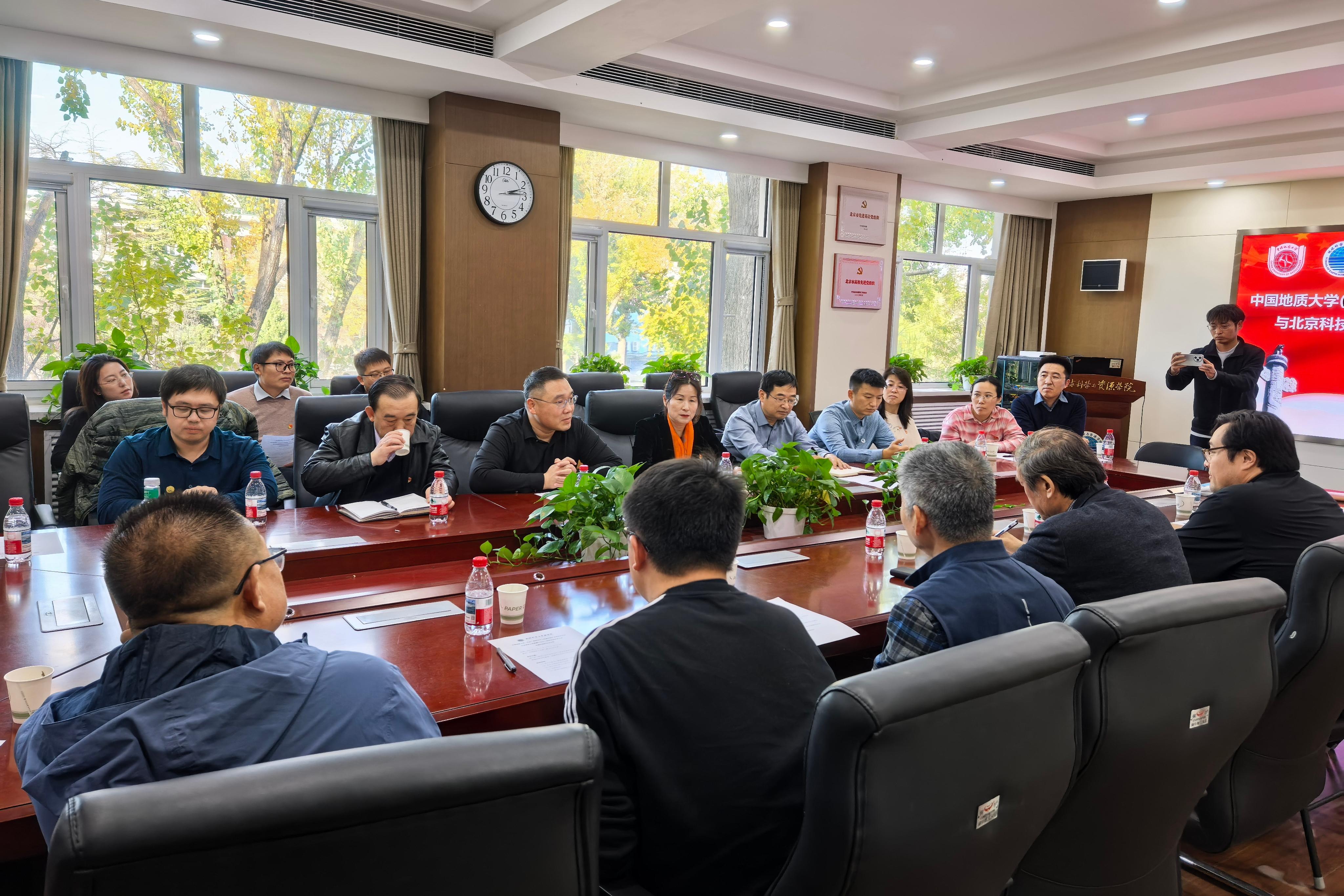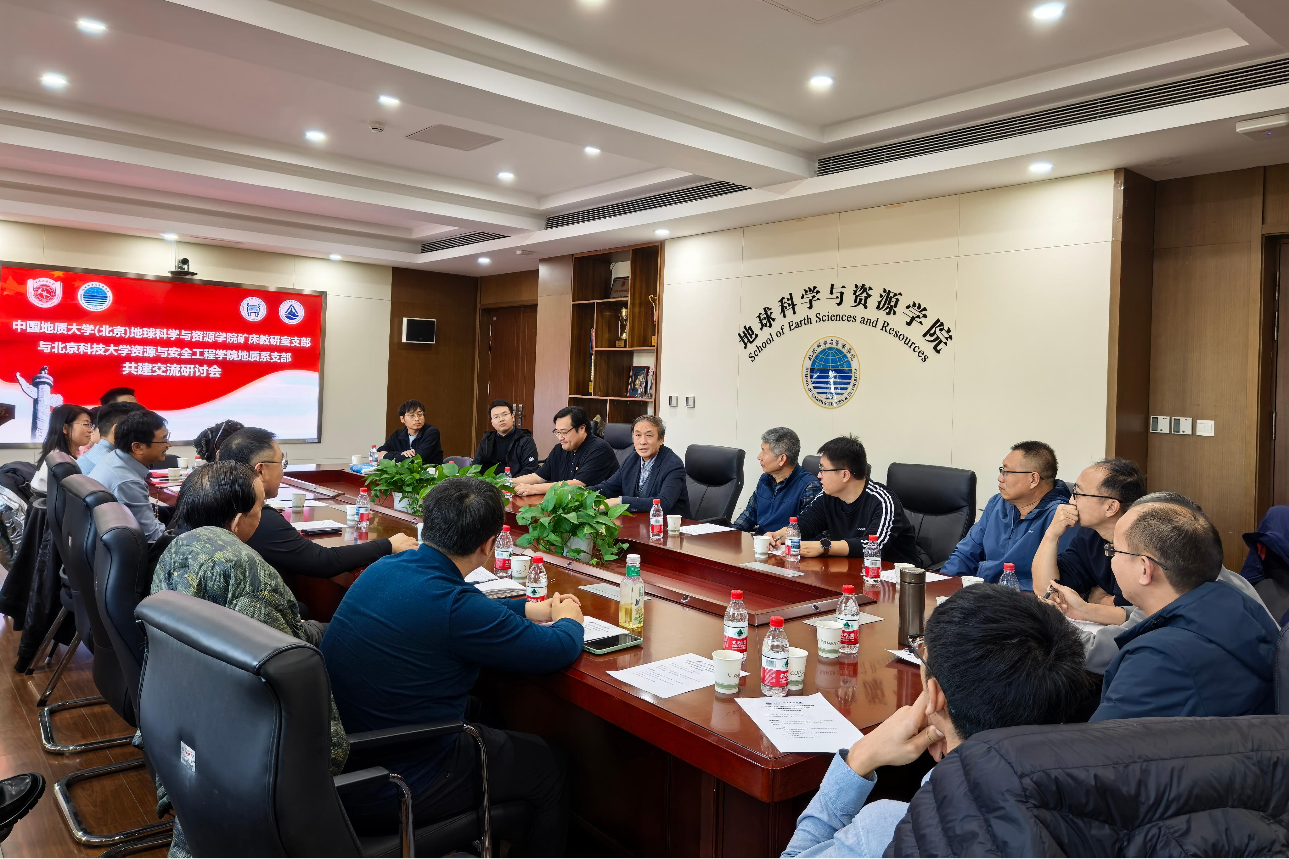11月11日下午,北京科技大学资源与安全工程学院地质系党支部与中国地质大学(北京)地球科学与资源学院矿床教研室党支部在中国地质大学(北京)举行了支部共建和交流研讨。活动以"深入学习贯彻习近平总书记关于教育的重要论述,深化高校基层党组织建设,促进校际资源共享与优势互补"为主题,旨在通过党建交流与学科研讨,促进两校地质学科的协同发展。中国科学院院士、中国地质大学(北京)原校长邓军,中国地质大学(北京)地球科学与资源学院党委副书记李梦瑜,北京科技大学资源与安全工程学院地质系教授谢玉玲,资源与安全工程学院副院长钟日晨,党委副书记、副院长贾兆义和双方支部全体党员教师参加研讨会。