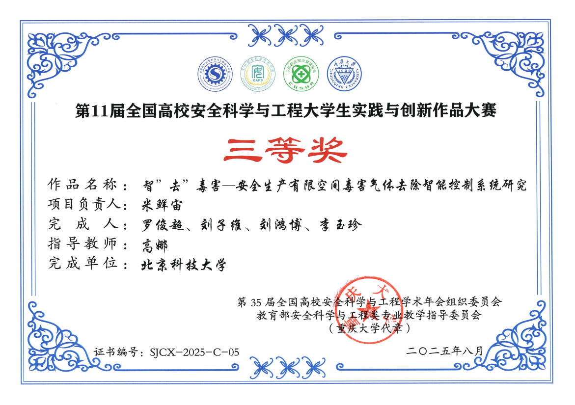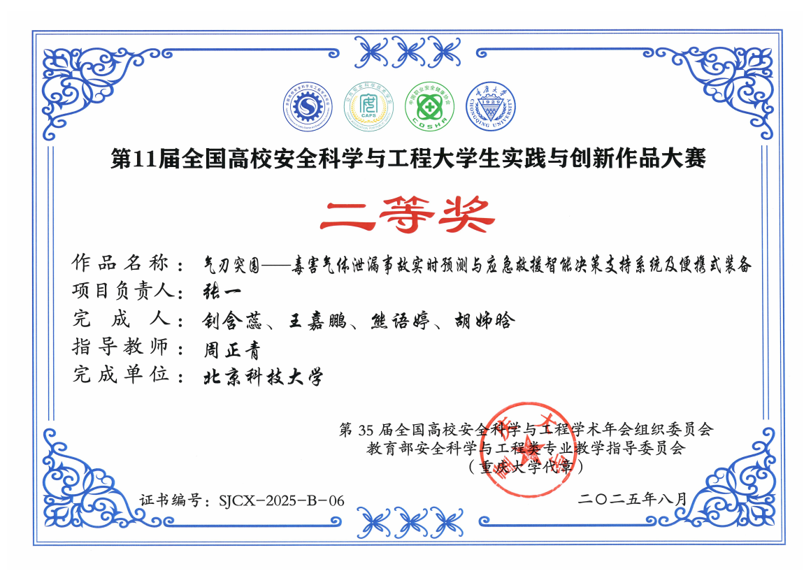 所获奖项:第11届全国高校安全科学与工程大学生实践与创新作品大赛国家级二等奖