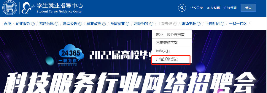 1.进入北科大学生就业指导中心(job.ustb.edu.cn),点击手续办理,选择下拉菜单“户口迁移登记”。