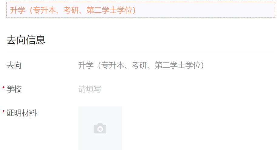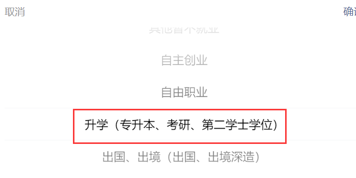 6.点击“无需就业协议 去向登记”,选择“升学”。