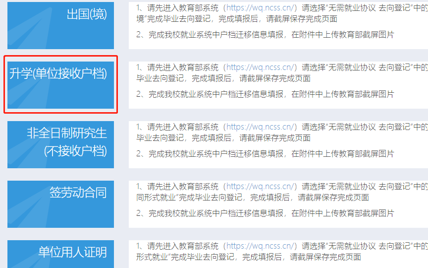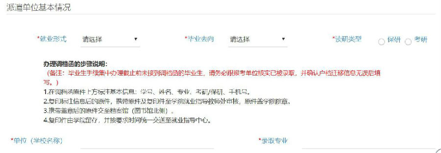 就业手续办理须知:毕业生明确毕业去向后,需填报就业信息、户口及档案信息。